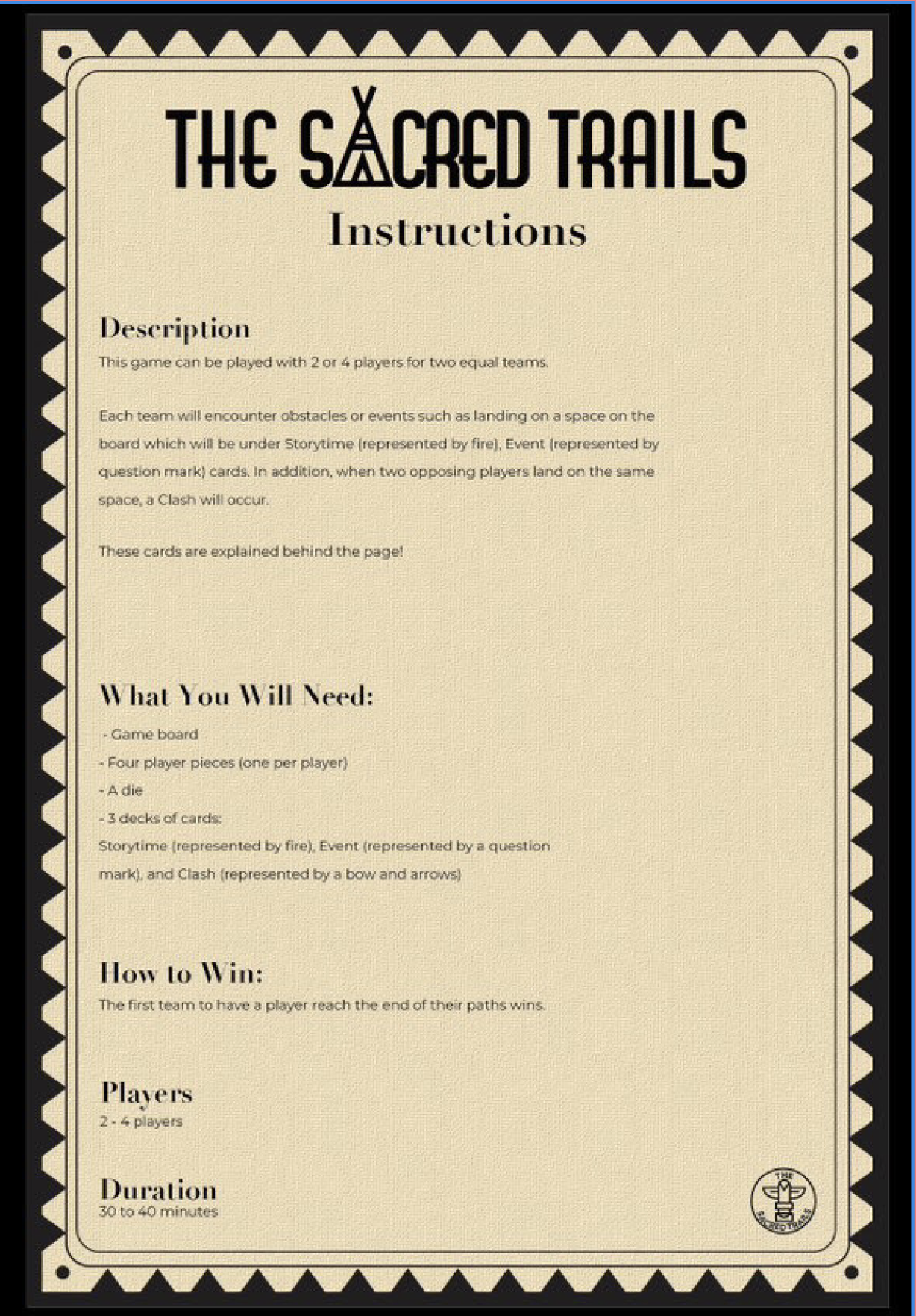 This project aims to design an educational and interactive board game that allows players to learn more about Indigenous culture and knowledge while having fun. Designed for two to four players (four recommended), the game lasts approximately 30 to 40 minutes and is based on both collaborative and competitive mechanics.